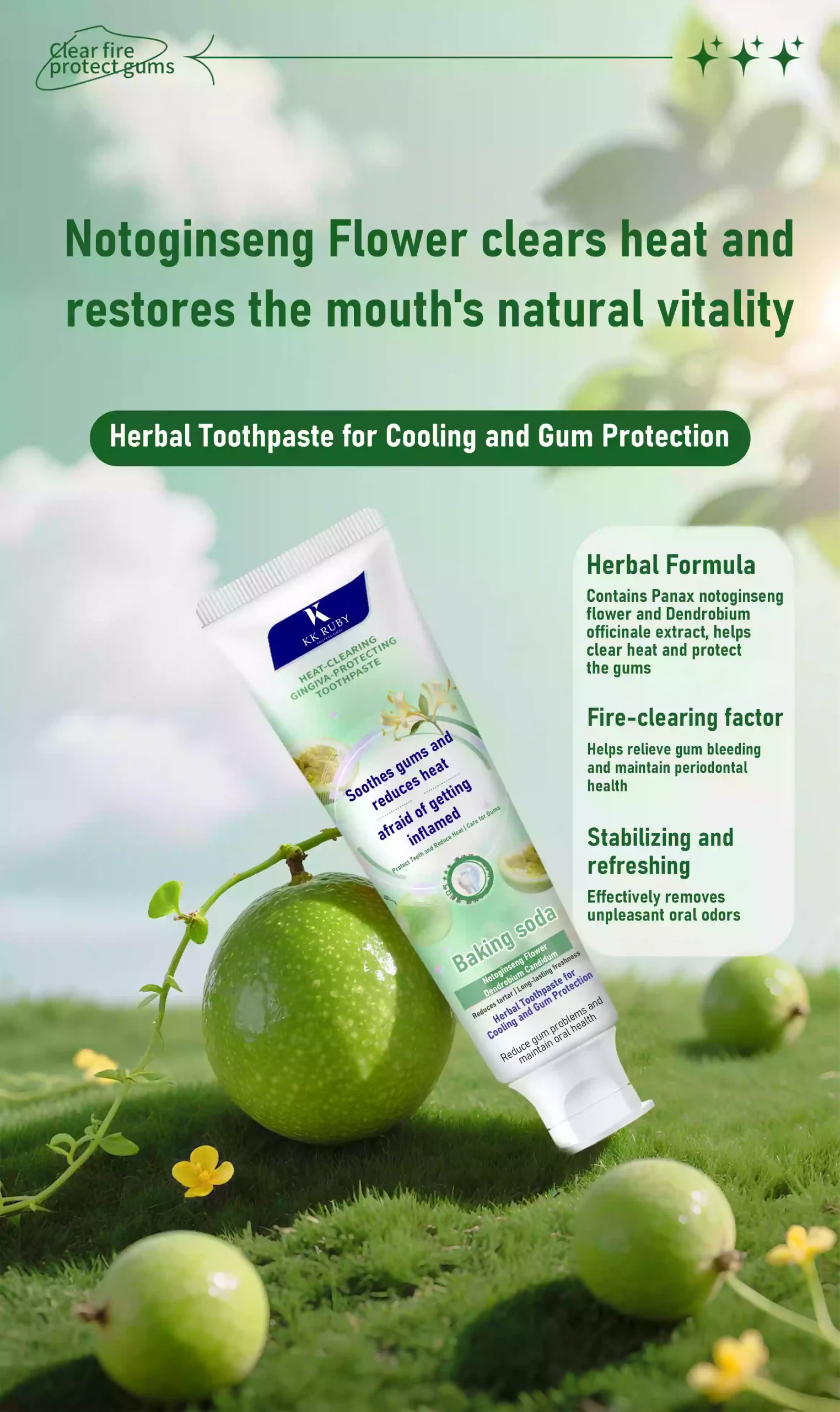 This Heat-Clearing Gingiva-Protecting formula (core slogan: Clear fire, protect gums) combines time-tested traditional Chinese herbal extracts with modern oral care science to effectively support gum health, reduce inflammation, and promote long-lasting freshness.