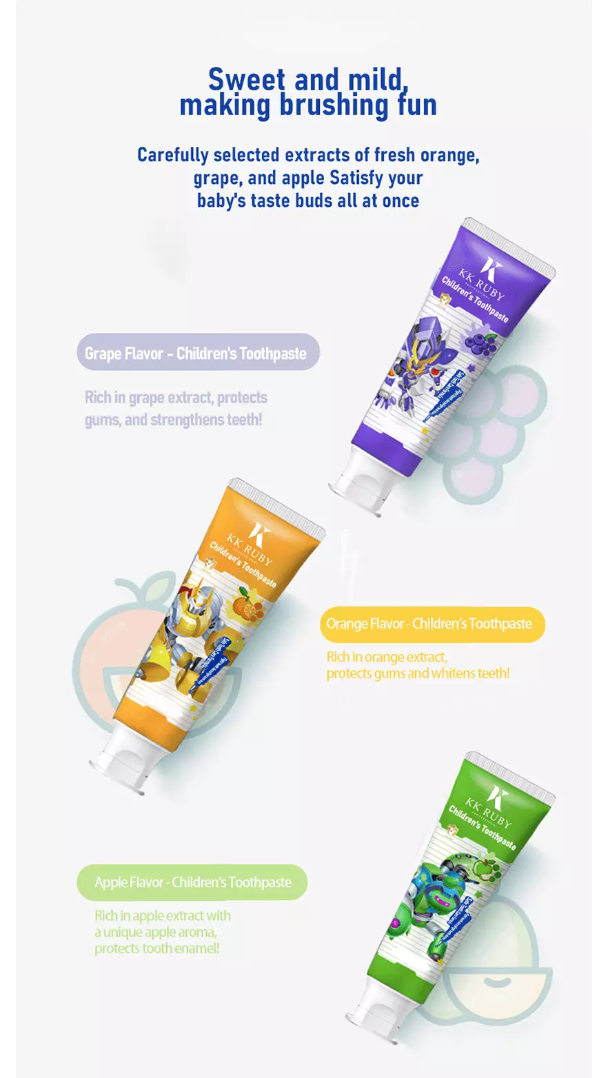 Grape, orange, apple flavors in probiotic children's toothpaste – rich extracts for gum protection and whitening, custom OEM private label