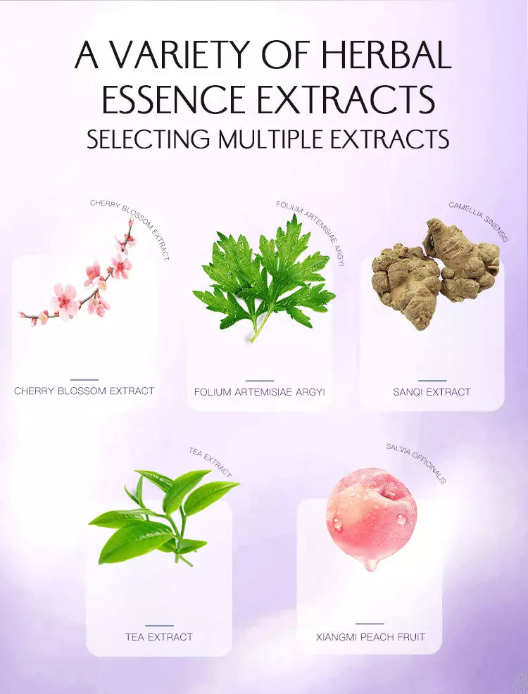 - Natural Herbal Extracts: Cherry blossom, Artemisia argyi, Sanqi, tea polyphenols, and honey peach provide antioxidant and soothing properties, drawing from traditional herbal knowledge validated by contemporary studies.